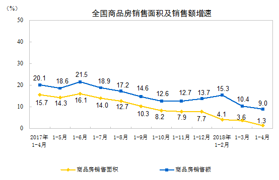 1-4月份,商品房销售面积42192万平方米,同比增长1.3%,增速比1-3月份回落2.3个百分点。其中,住宅销售面积增长0.4%,办公楼销售面积下降4.3%,商业营业用房销售面积增长7.0%。商品房销售额36222亿元,增长9.0%,增速回落1.4个百分点。其中,住宅销售额增长9.5%,办公楼销售额下降3.2%,商业营业用房销售额增长7.5%。