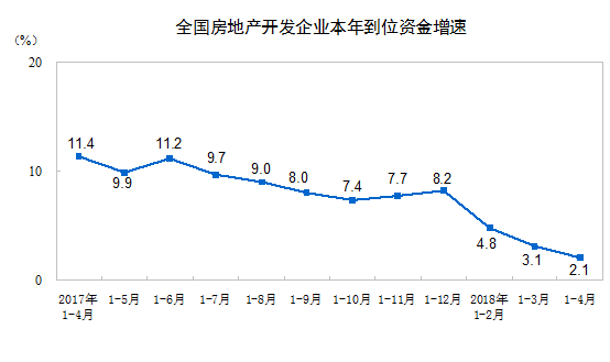 1-4月份,房地产开发企业到位资金48192亿元,同比增长2.1%,增速比1-3月份回落1个百分点。其中,国内贷款8637亿元,下降1.6%;利用外资17亿元,下降77.6%;自筹资金14894亿元,增长4.8%;定金及预收款14987亿元,增长8.3%;个人按揭贷款7148亿元,下降6.7%。