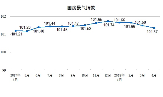 4月份,房地产开发景气指数(简称“国房景气指数”)为101.37,比3月份回落0.13点。