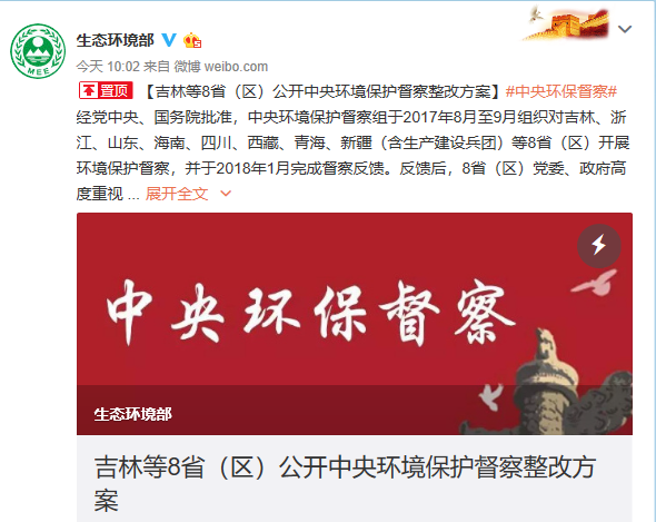 中证网讯 生态环境部官方微博5月29日消息,吉林等8省(区)今日公开中央环境保护督察整改方案。整改方案均围绕中央环境保护督察组反馈意见研究确定整改任务和目标,共计确定530项整改任务。
