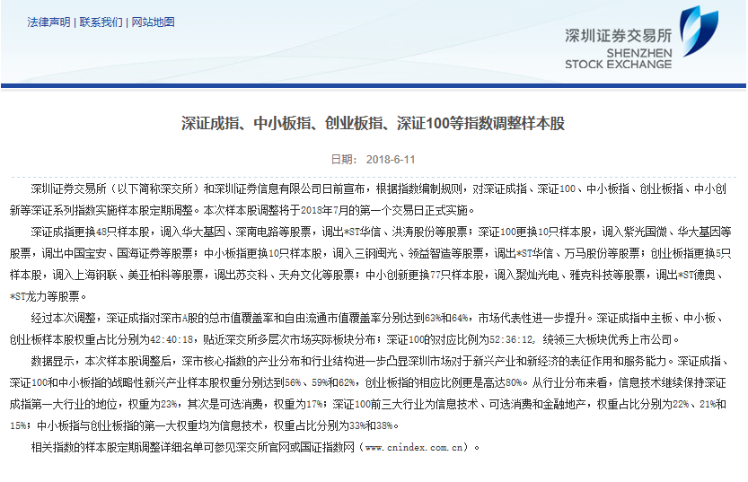 中证网讯 6月11日从深交所网站获悉,深交所和深圳证券信息有限公司日前宣布,根据指数编制规则,对深证成指、深证100、中小板指、创业板指、中小创新等深证系列指数实施样本股定期调整。本次样本股调整将于2018年7月的第一个交易日正式实施。经过本次调整,深证成指对深市A股的总市值覆盖率和自由流通市值覆盖率分别达到63%和64%,市场代表性进一步提升。