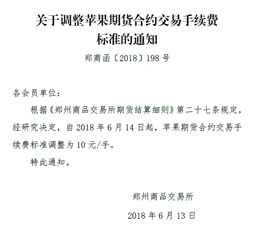 中证网讯 郑商所网站6月13日消息,根据《郑州商品交易所期货结算细则》第二十七条规定,郑商所经研究决定,自2018年6月14日起,苹果期货合约交易手续费标准调整为10元/手。