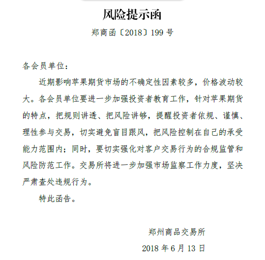 中证网讯 郑商所网站6月13日发布风险提示函,提示函显示,近期影响苹果期货市场的不确定性因素较多,价格波动较大。提醒投资者依规、谨慎、理性参与交易,切实避免盲目跟风,把风险控制在自己的承受能力范围内;同时,交易所将进一步加强市场监察工作力度,坚决严肃查处违规行为。