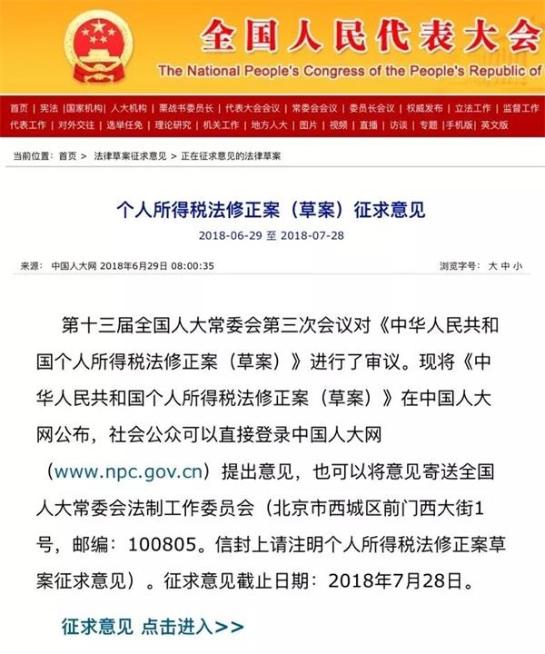 草案在中国人大网公布,社会公众可以直接登录中国人大网(www.npc.gov.cn)提出意见,也可以将意见寄送全国人大常委会法制工作委员会(北京市西城区前门西大街1号,邮编:100805。信封上请注明个人所得税法修正案草案征求意见)。