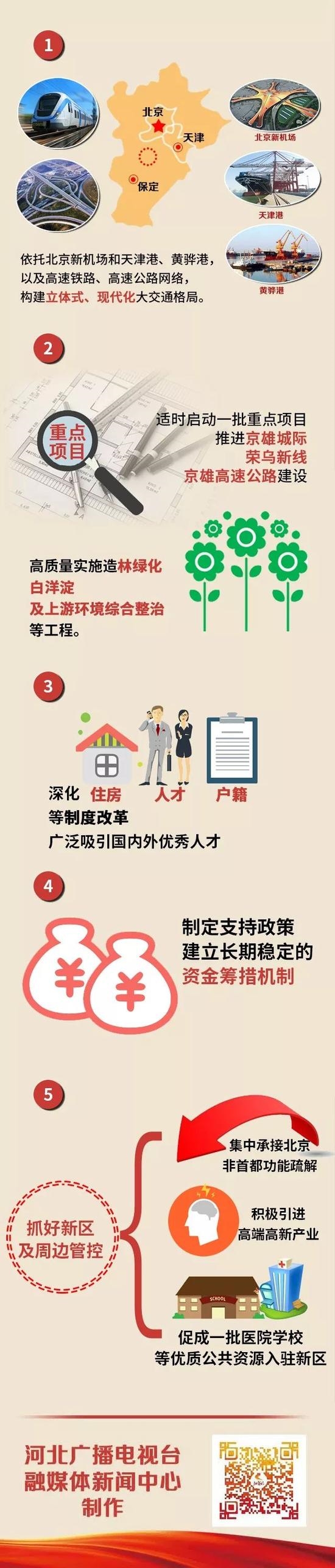 报告提出,2018年抓好新区及周边管控。集中承接北京非首都功能疏解,积极引进高端高新产业,促成一批医院、学校等优质公共资源入驻新区。为加强创新平台建设,报告提出实施创新机构倍增计划,争取国家实验室、重大科技基础设施等布局河北、布局雄安新区。
