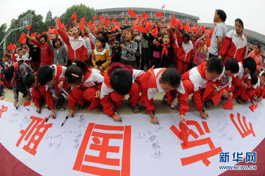 9月17日,在安徽省亳州市谯城区薛阁小学,学生们在“勿忘国耻 爱我中华”横幅上签名。当日,安徽省亳州市谯城区薛阁小学举行了解“九一八”事变的主题教育活动。 新华社发(张延林 摄)