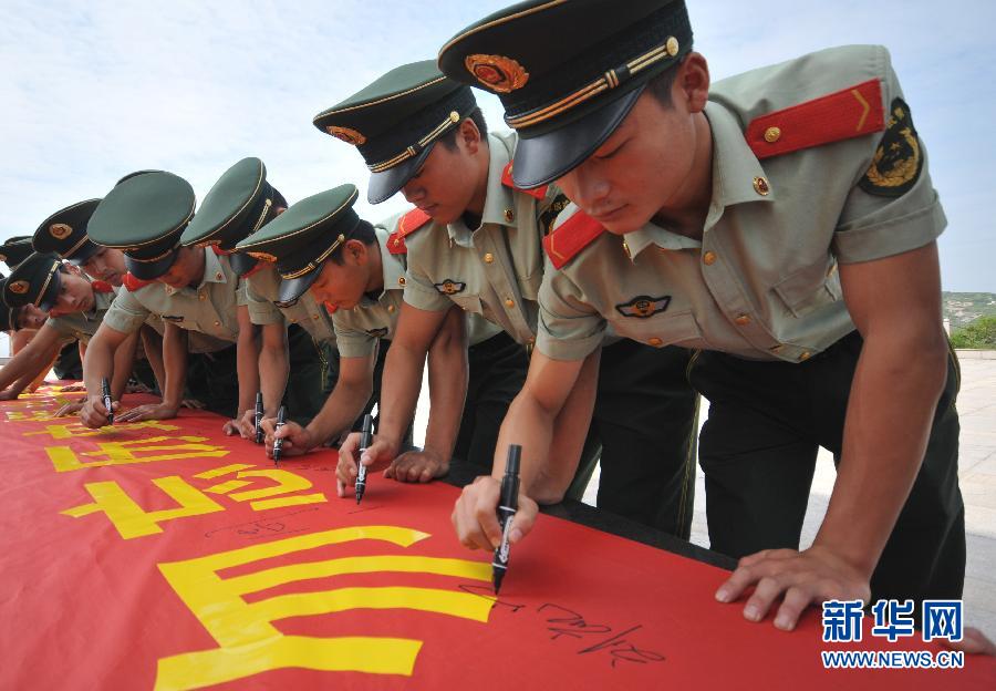 9月17日,在浙江省台州市温岭石塘镇,边防官兵在印有“勿忘历史、振兴中华”字样的横幅上签名。“九一八”事变爆发81周年纪念日前夕,台州市温岭边防大队开展以“勿忘历史、振兴中华”为主题的爱国主义教育活动。 新华社发(郏策摄)