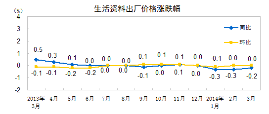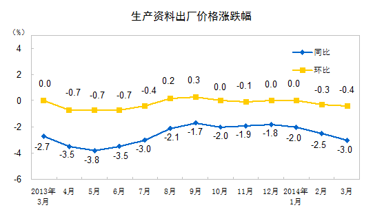 2014年3月份,全国工业生产者出厂价格同比下降2.3%,环比下降0.3%。工业生产者购进价格同比下降2.5%,环比下降0.5%。1-3月平均,工业生产者出厂价格同比下降2.0%,工业生产者购进价格同比下降2.1%。