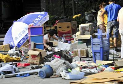 棚户区内正在整理垃圾。