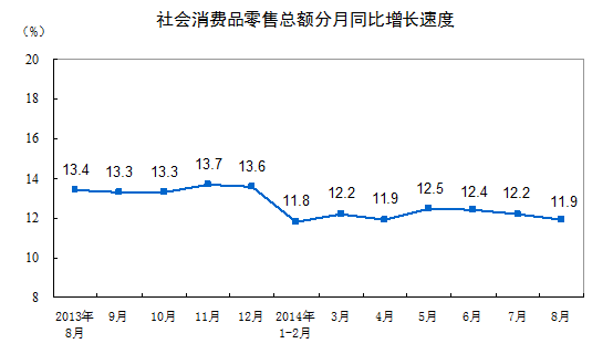 9月13日,国家统计局公布数据显示,2014年8月份,社会消费品零售总额21134亿元,同比名义增长11.9%(扣除价格因素实际增长10.6%,以下除特殊说明外均为名义增长)。其中,限额以上单位消费品零售额10466亿元,增长9.0%。1-8月份,社会消费品零售总额166108亿元,同比增长12.1%,预期为12.2%。其中,限额以上单位网上零售额2506亿元,增长54.9%。