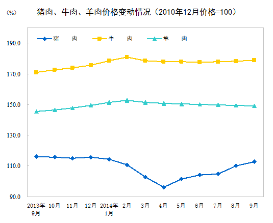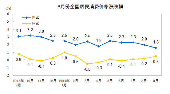 2014年9月份,全国居民消费价格总水平同比上涨1.6%。其中,城市上涨1.7%,农村上涨1.4%;食品价格上涨2.3%,非食品价格上涨1.3%;消费品价格上涨1.4%,服务价格上涨2.3%。1-9月平均,全国居民消费价格总水平比去年同期上涨2.1%。