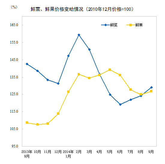 9月份,食品价格同比上涨2.3%,影响居民消费价格总水平上涨约0.78个百分点。其中,鲜果价格上涨16.7%,影响居民消费价格总水平上涨约0.33个百分点;蛋价上涨12.9%,影响居民消费价格总水平上涨约0.12个百分点;粮食价格上涨3.4%,影响居民消费价格总水平上涨约0.10个百分点;水产品价格上涨3.2%,影响居民消费价格总水平上涨约0.08个百分点;肉禽及其制品价格上涨1.2%,影响居民消费价格总水平上涨约0.09个百分点(猪肉价格下降2.9%,影响居民消费价格总水平下降约0.09个百分点);鲜菜价格下降9.4%,影响居民消费价格总水平下降约0.31个百分点。