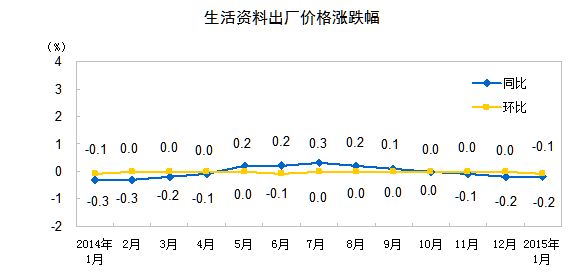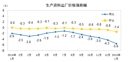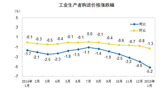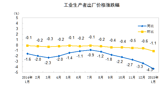 2015年1月份,全国工业生产者出厂价格同比下降4.3%,环比下降1.1%。工业生产者购进价格同比下降5.2%,环比下降1.3%。