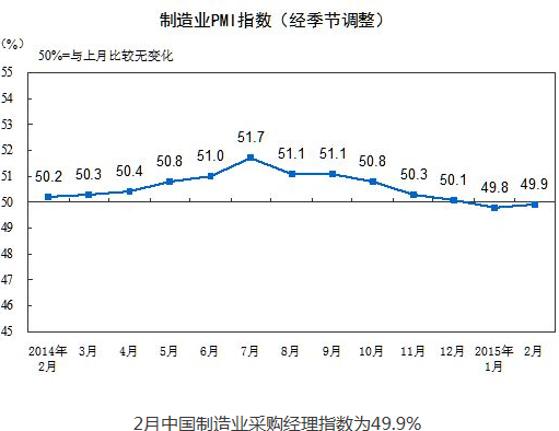 2015年2月,中国制造业采购经理指数(PMI)为49.9%,比上月微升0.1个百分点,表明制造业收缩幅度收窄。