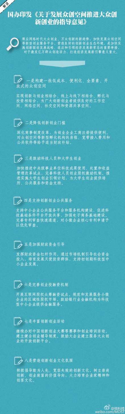 科学技术部官方微博发布消息称, 国办日前印发《关于发展众创空间推进大众创新创业的指导意见》,指出推进大众创新创业要坚持市场导向、加强政策集成、强化开放共享、创新服务模式,重点抓好以下八个方面的任务: