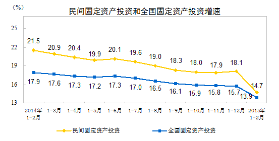 2015年1-2月份,民间固定资产投资21915亿元,同比名义增长14.7% ,高于全国固定资产投资增速0.8个百分点。民间固定资产投资占全国固定资产投资(不含农户)的比重为63.6%,比去年同期提高0.5个百分点。