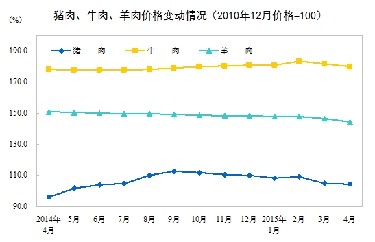 2015年4月份,全国居民消费价格总水平同比上涨1.5%。其中,城市上涨1.6%,农村上涨1.3%;食品价格上涨2.7%,非食品价格上涨0.9%;消费品价格上涨1.3%,服务价格上涨2.1%。1-4月平均,全国居民消费价格总水平比去年同期上涨1.3%。