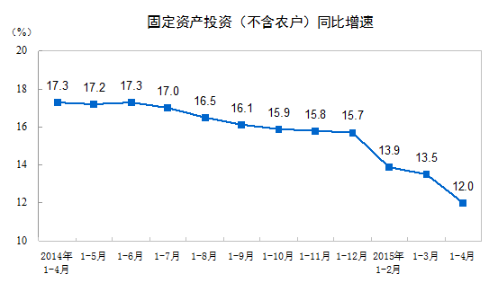 2015年1-4月份,全国固定资产投资(不含农户)119979亿元,同比名义增长12.0%,增速比1-3月份回落1.5个百分点。从环比速度看,40.89%。