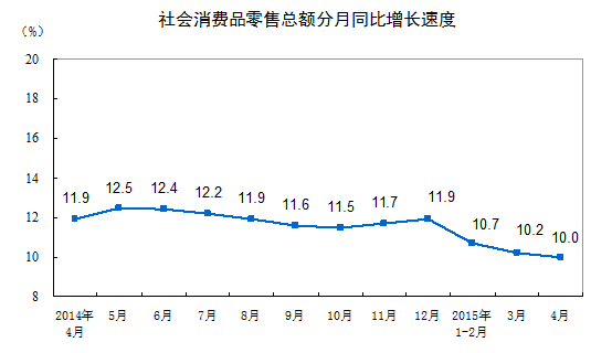 2015年4月份,社会消费品零售总额22387亿元,同比名义增长10.0%(扣除价格因素实际增长9.9%,以下除特殊说明外均为名义增长)。其中,限额以上单位消费品零售额10564亿元,增长6.7%。