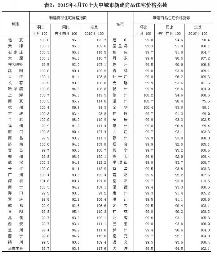 (二)与去年同月相比,70个大中城市中,价格下降的城市有69个,上涨的城市有1个。4月份,同比价格变动中,最高涨幅为0.7%,最低为下降10.3%。