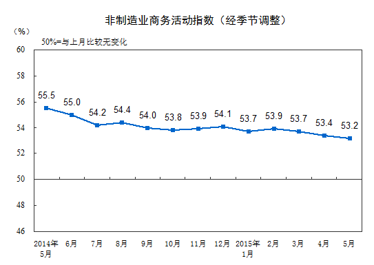 2015年5月份,中国非制造业商务活动指数为53.2%,比上月小幅回落0.2个百分点,高于临界点3.2个百分点,表明我国非制造业继续保持平稳增长状态,但增速略有放缓。