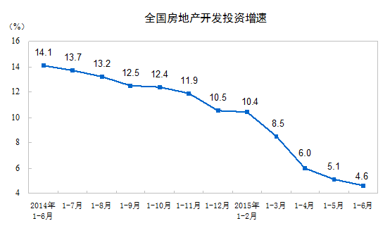 2015年1-6月份,全国房地产开发投资43955亿元,同比名义增长4.6%(扣除价格因素实际增长5.7%),增速比1-5月份回落0.5个百分点。其中,住宅投资29506亿元,增长2.8%,增速回落0.1个百分点。住宅投资占房地产开发投资的比重为67.1%。