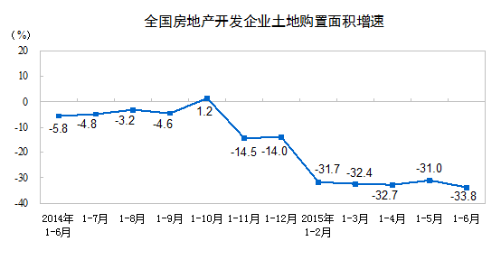 1-6月份,房地产开发企业土地购置面积9800万平方米,同比下降33.8%,降幅比1-5月份扩大2.8个百分点;土地成交价款2866亿元,下降28.9%,降幅扩大3.1个百分点。