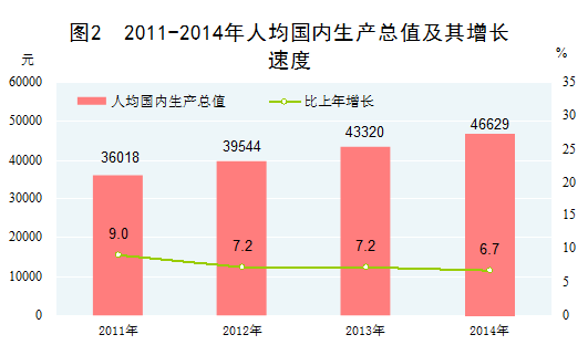 人均国内生产总值稳步提高。2014年,我国人均国内生产总值46629元,扣除价格因素,比2010年增长33.6%,年均实际增长7.5%。根据世界银行数据,我国人均国民总收入由2010年的4300美元提高至2014年的7380美元,在上中等收入国家中的位次不断提高。