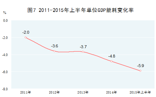 节能降耗成效显著。加强工业、交通、建筑等重点领域节能,积极发展绿色低碳产业,能源消费结构发生深刻变化,单位产出能耗水平大幅下降。2014年,水电、风电、核电、天然气等清洁能源消费量占能源消费总量的比重为16.9%,比2010年提高3.5个百分点。2011-2014年,单位国内生产总值能耗累计下降13.4%,2015年上半年同比下降5.9%。