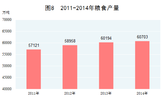 农业基础进一步巩固。2014年,粮食总产量取得历史性突破,达到60703万吨,比2010年增长11.1%,年均增长2.7%,实现“十一连增”。近年来,我国谷物、肉类、籽棉、花生、茶叶、水果等农产品产量稳居世界第一位。