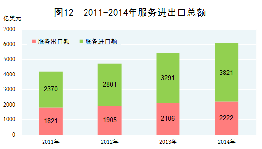 服务贸易取得长足发展。2014年,服务进出口总额达到6043亿美元,比2010年增长66.7%,年均增长13.6%。服务贸易结构逐步优化,计算机、保险、金融、咨询等高附加值服务贸易出口增长势头强劲。