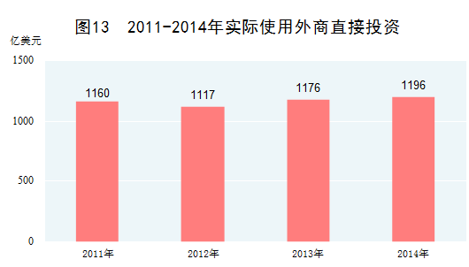 利用外资规模跃居世界第一。利用外资从追求量的扩大转向质的提高。2011-2014年,我国累计实际使用外商直接投资4649亿美元,年均增长3.1%,其中,2014年实际使用外商直接投资1196亿美元,首次跃居全球第一。外商投资领域也从一般制造业向高技术产业和金融、保险等服务业拓展。