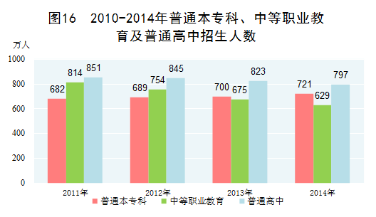 教育事业成绩显著。2014年,小学学龄儿童净入学率达到99.8%;中等职业教育招生629万人,在校生1803万人,毕业生633万人;全国普通本专科招生721万人,在校生2548万人,毕业生659万人,分别比2010年增加60万人、316万人、84万人;高等教育毛入学率达到37.5%,比2010年提高11个百分点。