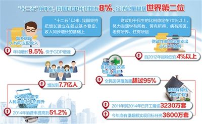 “获得感”来自日渐丰厚的收入。立国之道,惟在富民。针对2020年全面建成小康社会的宏伟目标,党的十八大提出“实现国内生产总值和城乡居民人均收入比2010年翻一番”的新指标。“十二五”以来,我国坚持把增长建立在就业基本稳定、收入同步增长的基础上。2014年人均GDP达到7589美元,迈入中等偏上收入国家行列。城乡居民人均可支配收入年均增长9.5%,快于GDP增速,居民家庭财产稳定增加。分配制度不断完善,居民收入在国民收入分配中的比重、劳动报酬在初次分配中的比重逐步提高。虽然经济增速放缓,新增就业却不降反增,城乡就业人员增加到7.7亿人,促进就业创业的政策体系初步形成。就业充分、收入增加,带来了人民消费水平的提升。新的消费增长点不断产生,亿万群众的消费潜力成为拉动经济增长的强劲动力,2014年消费率提高到51.2%,消费需求对增长的贡献率提高到了50.2%,经济发展和民生改善的良性循环正在形成。
