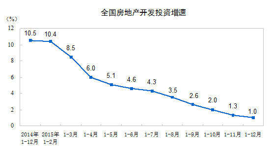 1月19日,国家统计局发布数据显示,2015年,全国房地产开发投资95979亿元,比上年名义增长1.0%(扣除价格因素实际增长2.8%),增速比1-11月份回落0.3个百分点。其中,住宅投资64595亿元,增长0.4%,增速回落0.3个百分点。住宅投资占房地产开发投资的比重为67.3%。