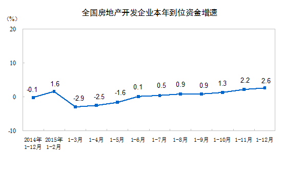2015年,房地产开发企业到位资金125203亿元,比上年增长2.6%,增速比1-11月份提高0.4个百分点。其中,国内贷款20214亿元,下降4.8%;利用外资297亿元,下降53.6%;自筹资金49038亿元,下降2.7%;其他资金55655亿元,增长12.0%。在其他资金中,定金及预收款32520亿元,增长7.5%;个人按揭贷款16662亿元,增长21.9%。