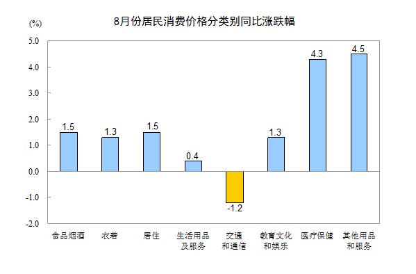 8月份,其他七大类价格同比六涨一降。其中,其他用品和服务、医疗保健、居住、衣着、教育文化和娱乐、生活用品及服务价格分别上涨4.5%、4.3%、1.5%、1.3%、1.3%、0.4%;交通和通信价格下降1.2%。