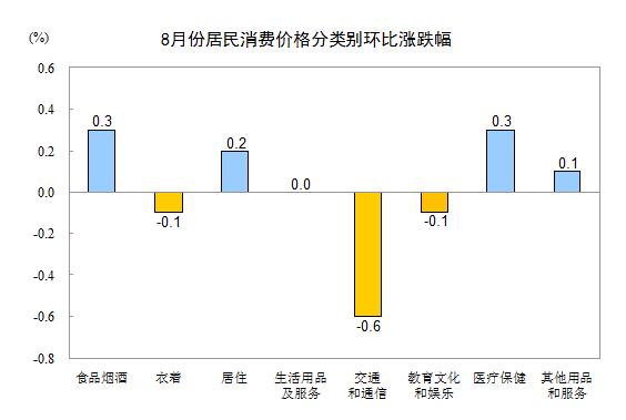 8月份,其他七大类价格环比三涨三降一平。其中,医疗保健、居住、其他用品和服务价格分别上涨0.3%、0.2%、0.1%;交通和通信、衣着、教育文化和娱乐价格分别下降0.6%、0.1%、0.1%;生活用品及服务价格持平。
