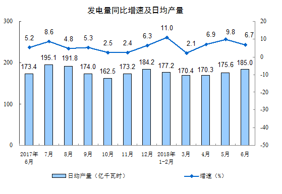 2018年6月份,规模以上工业增加值同比实际增长6.0%(以下增加值增速均为扣除价格因素的实际增长率),比5月份回落0.8个百分点。从环比看,6月份,规模以上工业增加值比上月增长0.36%。1-6月份,规模以上工业增加值同比增长6.7%,增速较1-5月份回落0.2个百分点。