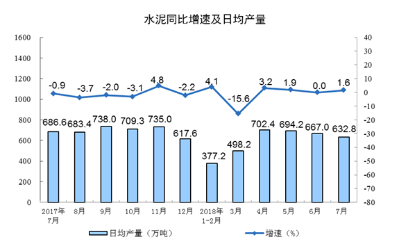分产品看,7月份,596种产品中有345种产品同比增长。其中,钢材9569万吨,同比增长8.0%;水泥19618万吨,增长1.6%;十种有色金属462万吨,增长8.5%;乙烯158万吨,增长7.5%;汽车206.4万辆,下降0.5%;轿车90.4万辆,增长4.3%;发电量6400亿千瓦时,增长5.7%;原油加工量5075万吨,增长11.6%。
