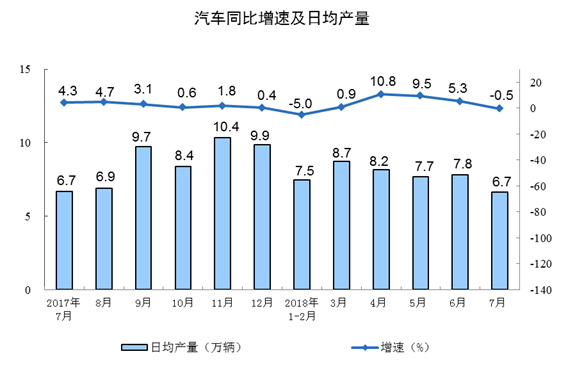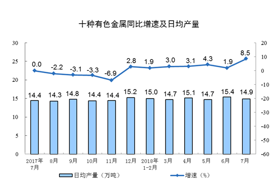 分行业看,7月份,41个大类行业中有35个行业增加值保持同比增长。其中,农副食品加工业增长6.9%,纺织业增长0.6%,化学原料和化学制品制造业增长3.5%,非金属矿物制品业增长5.2%,黑色金属冶炼和压延加工业增长6.6%,有色金属冶炼和压延加工业增长5.6%,通用设备制造业增长6.9%,专用设备制造业增长11.2%,汽车制造业增长6.3%,铁路、船舶、航空航天和其他运输设备制造业下降1.9%,电气机械和器材制造业增长5.7%,计算机、通信和其他电子设备制造业增长13.5%,电力、热力生产和供应业增长8.8%。