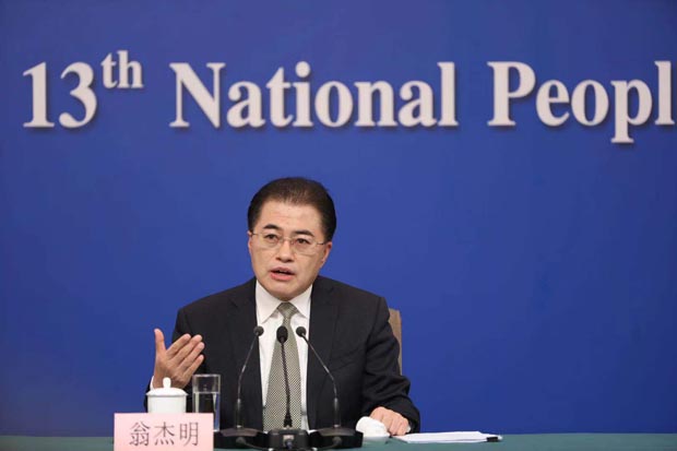 国资委副主任翁杰明回答中国证券报记者提问。(摄影/本报记者 车亮)