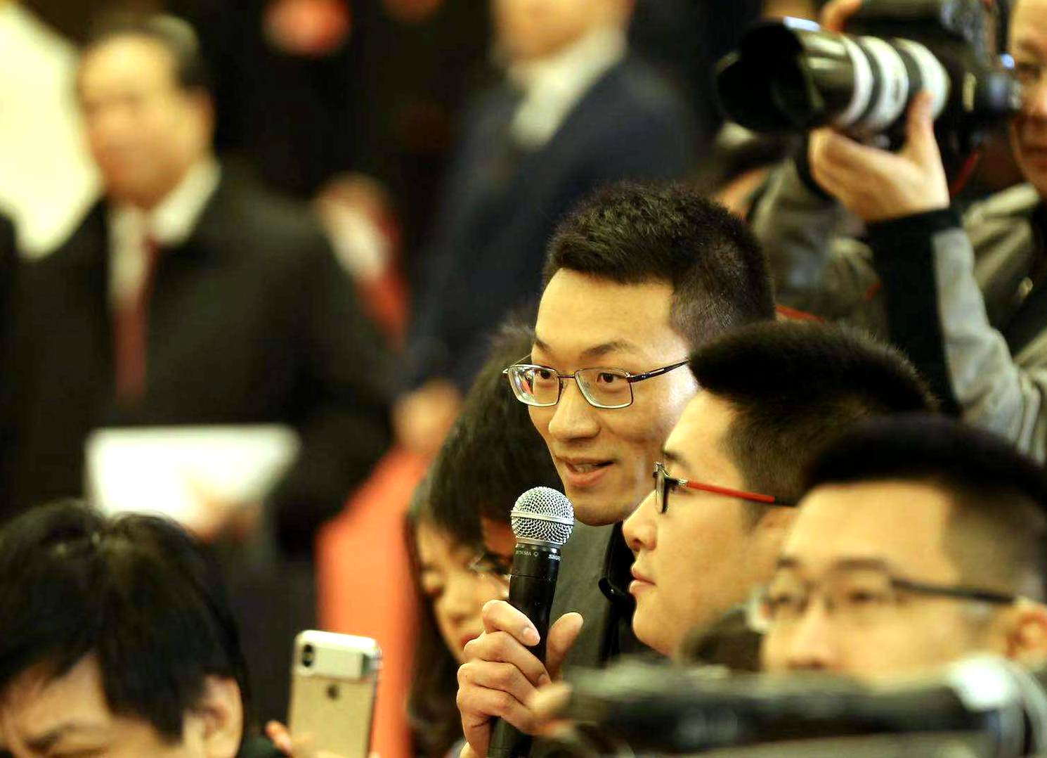 中国证券报记者在“部长通道”上向国家税务总局局长王军提问。(摄影/本报记者 车亮)
