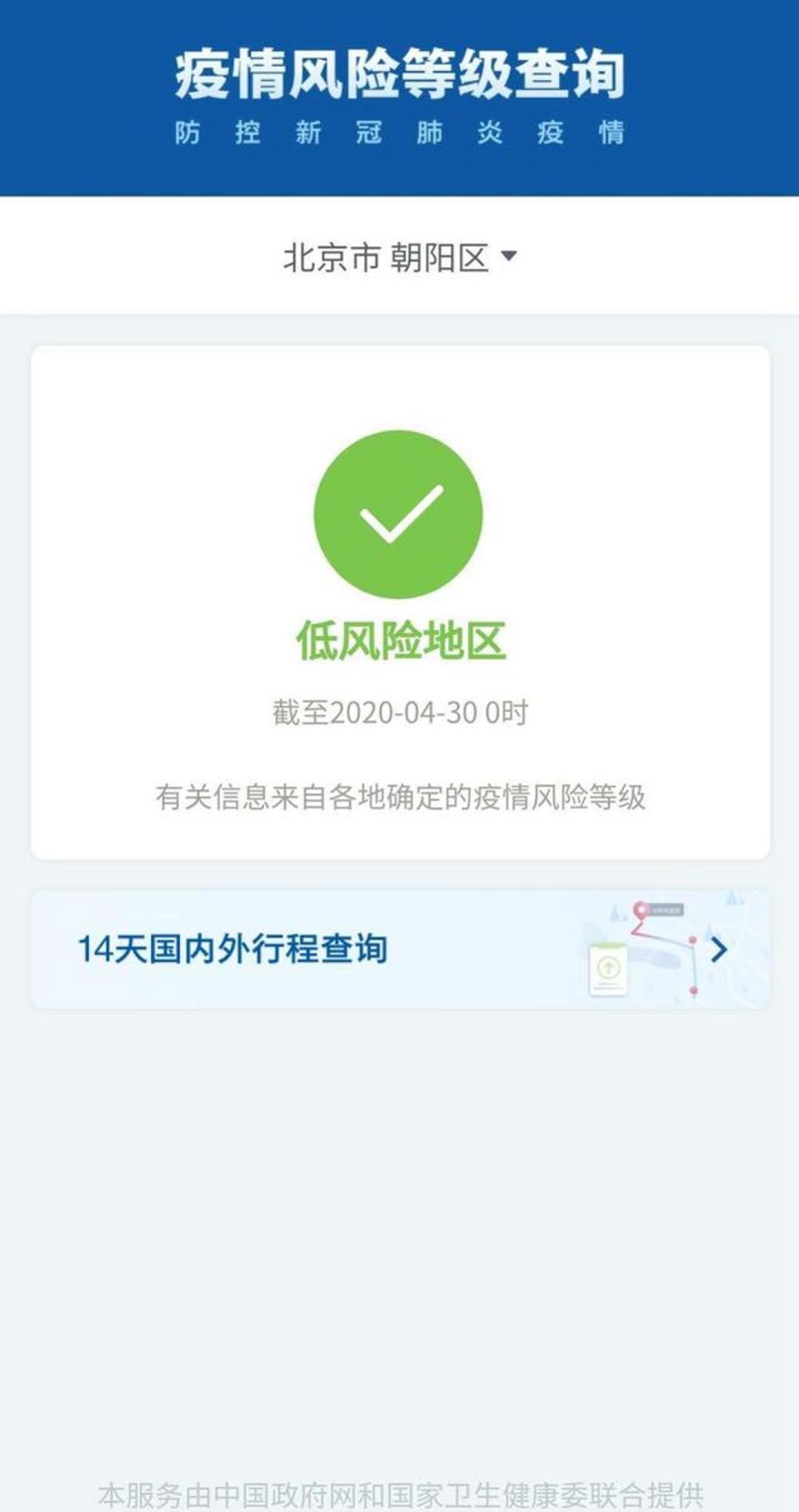国务院客户端信息显示,北京朝阳区风险等级降为低风险地区,时间显示是截止到2020年4月30日0时的信息。