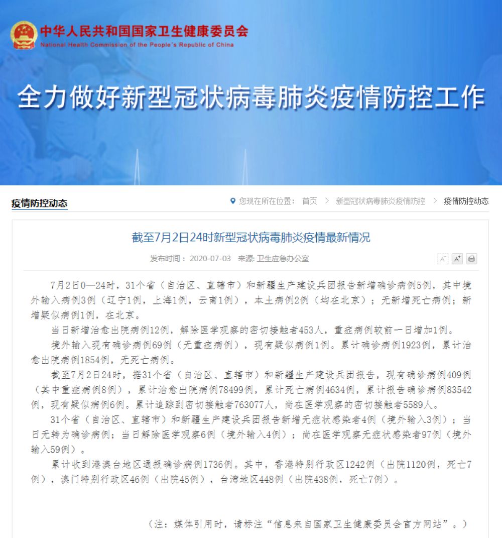 国家卫健委:7月2日新增确诊病例5例 其中本土病例2例