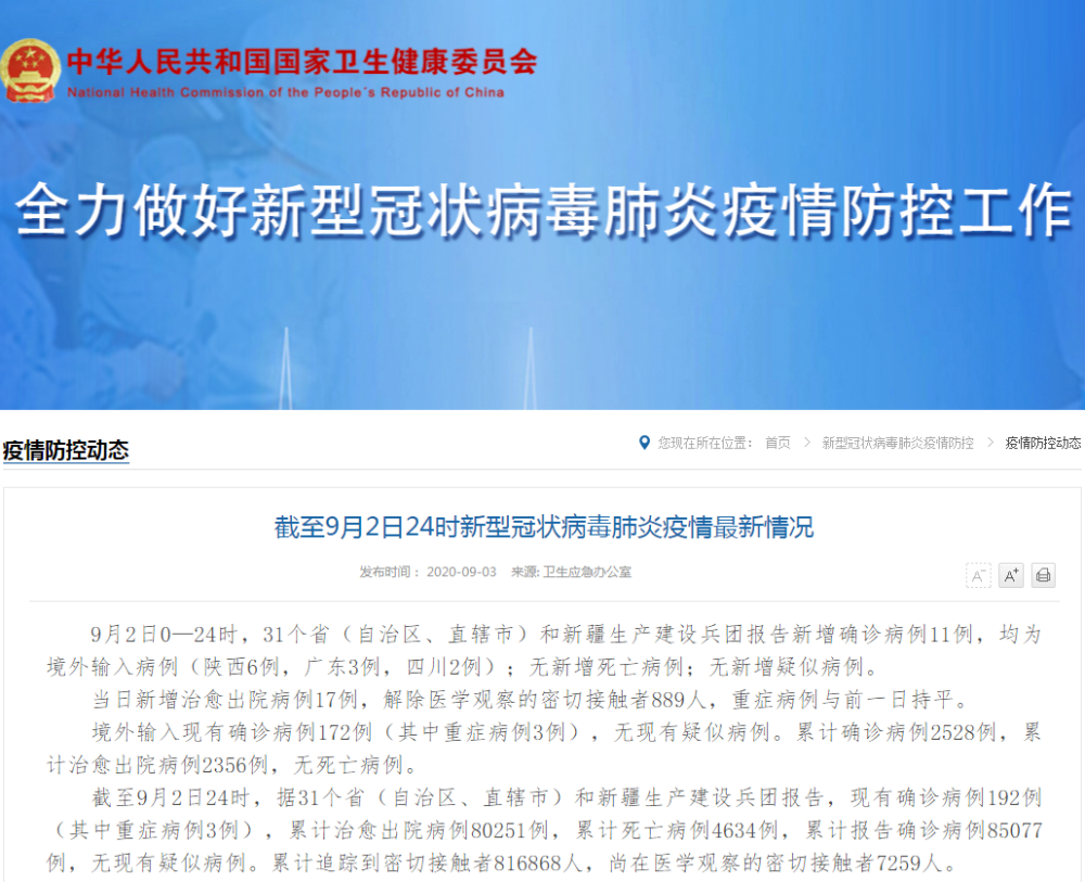 国家卫健委:9月2日新增确诊病例11例 均为境外输入