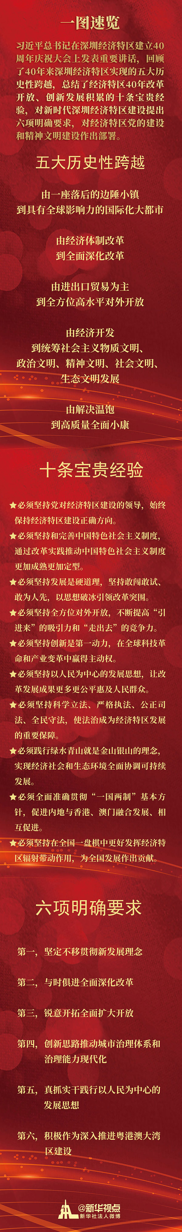习近平总书记在深圳经济特区建立40周年庆祝大会上发表重要讲话,回顾了40年来深圳经济特区实现的五大历史性跨越,总结了经济特区40年改革开放、创新发展积累的十条宝贵经验,对新时代深圳经济特区建设提出六项明确要求,对经济特区党的建设和精神文明建设作出部署。