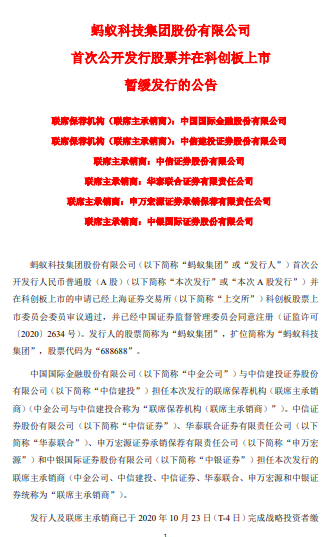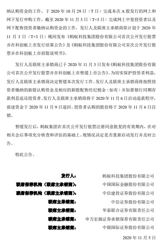 蚂蚁集团(688688)11月5日晚间公告,发行人及联席主承销商已于 2020 年 11 月 3 日发布《蚂蚁科技集团股份有限公司首次公开发行股票并在科创板上市暂缓上市公告》。为切实保护投资者利益,发行人及联席主承销商决定暂缓本次发行工作。发行人及联席主承销商将按照投资者缴纳的新股认购资金及相应的新股配售经纪佣金(如有)并加算银行同期存款利息返还投资者。