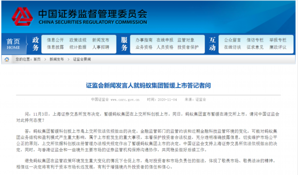证监会新闻发言人表示,近期,上交所依据科创板注册管理办法相关规定作出了暂缓蚂蚁集团上市的决定。蚂蚁集团与主承销商经协商一致,拟于2020年11月6日启动退回A股网上、网下申购资金及战略投资者缴纳的认购资金等款项。