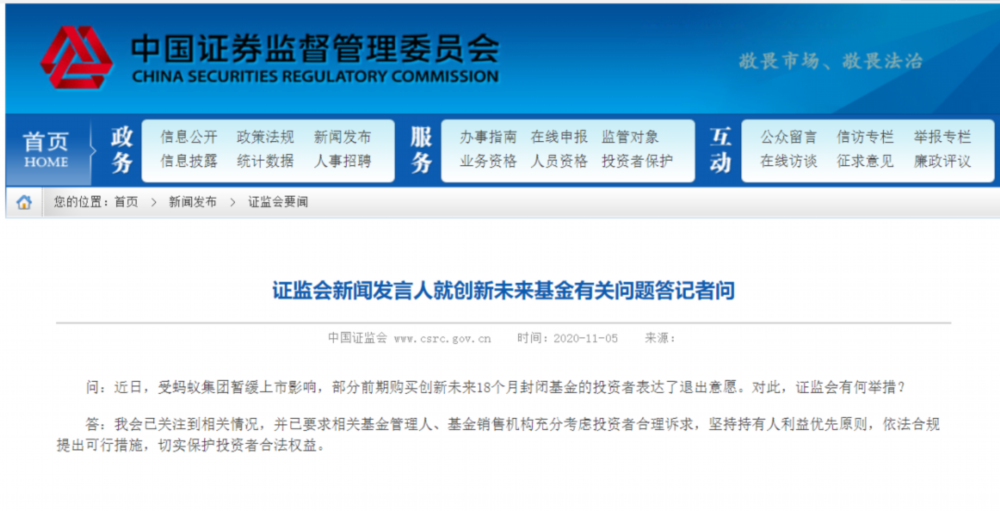 随后,证监会新闻发言人也就蚂蚁集团暂缓上市和创新未来基金有关问题作出回应。